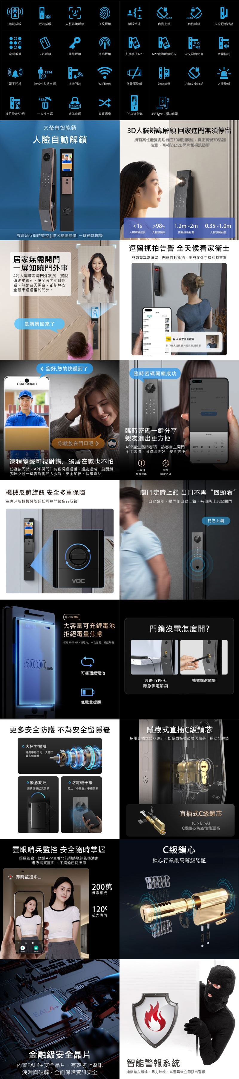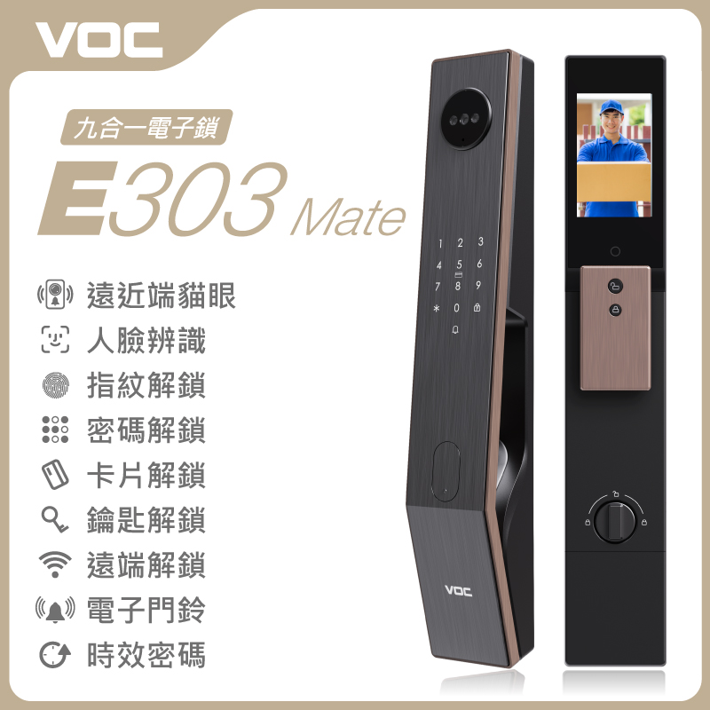 VOC電子鎖 E303 Mate 九合一電子門鎖是VOC目前所推出功能最強大的旗艦款大門電子鎖,當出門工作不在家期間可透過手機APP查看門外訪客、外出能也能遠端掌握家門外狀況;當有訪客按下門鈴時,手機APP會自動推播讓主人看清楚門外的狀況,確認訪客後再開門提升居家安全,當外出時還可透過手機App遠端與訪客溝通,並在有訪客按門鈴時從視訊貓眼拍攝照片,在手機App中查看歷史照片;當發現有人在門前逗留時,鎖體拍攝照片並推播警報訊息至手機App 。用戶可透過手機連接貓眼進行語音溝通,還可有效嚇跑盜賊;手機APP還能自動記錄成員回家時間,掌握家人每天的回家時間。