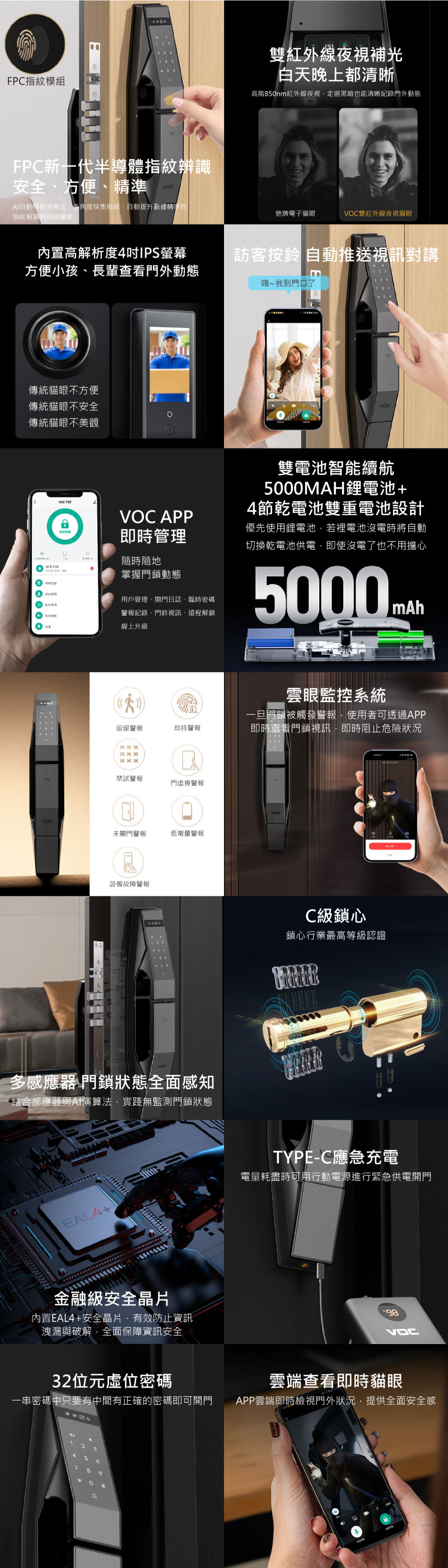 視訊鏡頭具備紅外線功能,可全天候看清門外視野,支援AI人臉識別演算法,能辨識各種面容資訊,下次使用時能更快速完成辨識,鎖體雙電池智能續航,5000MAH鋰電池+4節乾電池雙重電池設計,優先使用鋰電池,若裡電池沒電時將自動切換乾電池供電,即使沒電了也不用擔心,當電量過低時,手機App自動推播低電通知,內、外門鎖採用鋁合金材質,面板表面採用IML工藝,霧面質感搭輔以絲紋理,不易沾染指紋和灰塵。同時獨特的外型,給人一種未來感的感覺,適用市面上絕大多數的門扇。