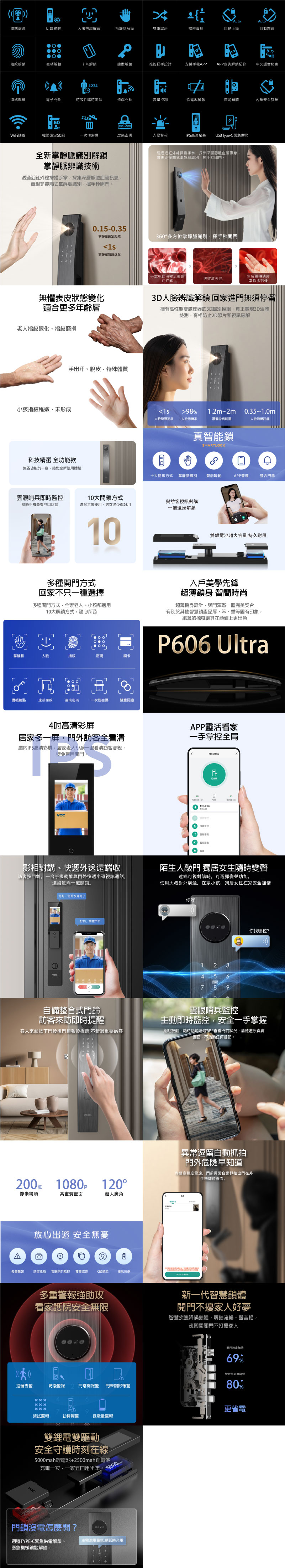 VOC電子鎖 VOC P606 Ultra 十合一電子門鎖是VOC目前所推出功能最強大的旗艦款大門電子鎖,擁有最先進掌靜脈辨識解鎖技術,透過紅外線掃瞄手掌,採集深層靜脈血管訊息,實現非接觸式掌靜脈識別,揮手秒開門。