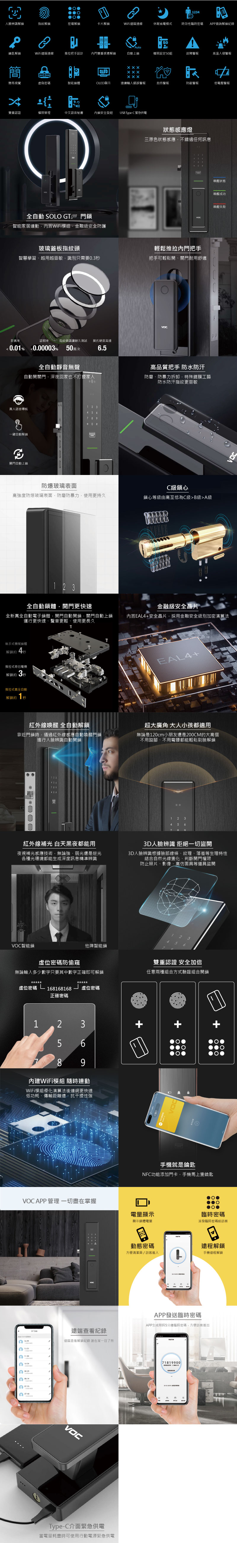 VOC SOLO GTF 六合一電子鎖是VOC目前的旗艦款門鎖,內外門鎖採用航空級別合金材質,面板表面採用IML工藝,霧面質感搭輔以絲紋理,不易沾染指紋和灰塵。同時搭配側邊的金色邊框,給人一種高貴精緻的感覺。