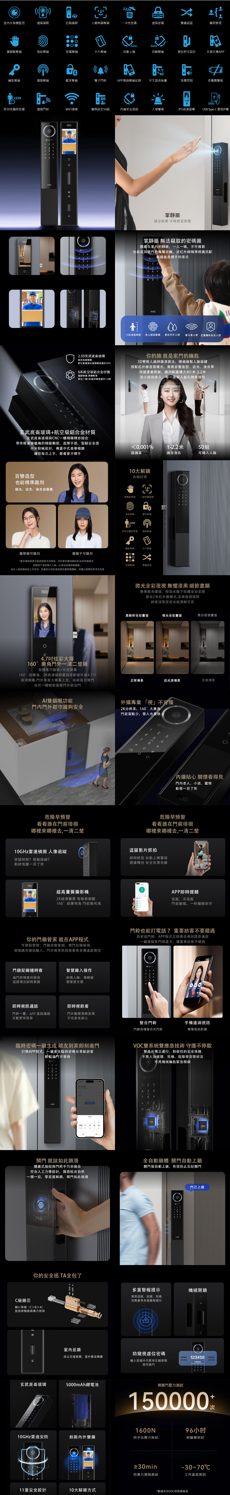 視訊鏡頭具備紅外線功能,可全天候看清門外視野,支援AI人臉識別演算法,能辨識各種面容資訊,下次使用時能更快速完成辨識,鎖體內建5,000mAh大容量鋰電池,充滿一次電約可使用 60 天,當電量過低時,手機App自動推播低電通知,內、外門鎖採用鋁合金材質,面板表面強化鏡面玻璃。同時搭配全黑配色,給人一種低調奢華的感覺,適用市面上絕大多數的門扇。