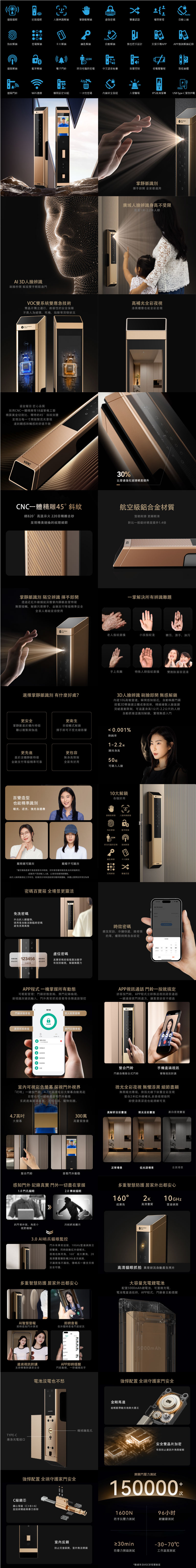 全機航空鋁外殼+強化玄武崑崙玻璃,使用5000mAh 大容量鋰電池,支援低電提醒與低功耗快醒技術。搭配精雕質感設計,適用市面上多數門型,展現極致科技與低調奢華。